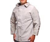Blusão em raspa de couro, com mangas compridas acopladas ao blusão e fechamento frontal através de botões de pressão metálicos ou velcro.