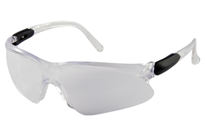 Óculos de segurança, com armação e visor confeccionados em uma única peça de policarbonato e haste tipo espátula.